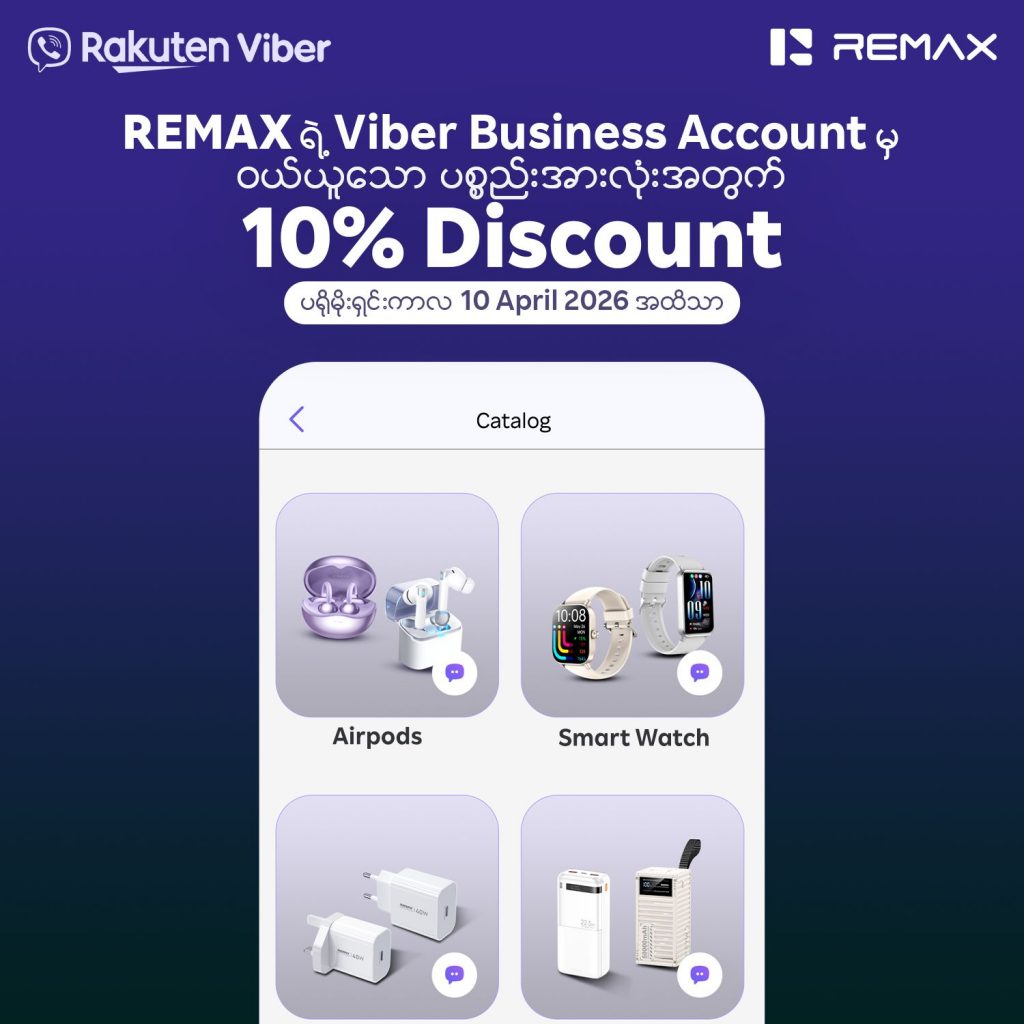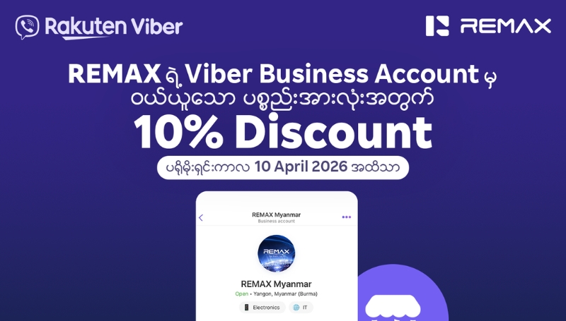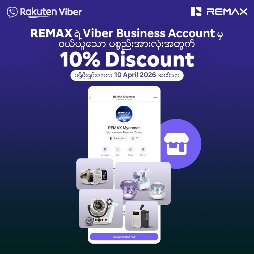 REMAX ၏ Business Account အသစ် စတင်မိတ်ဆက်ခြင်း အထိမ်းအမှတ်အဖြစ် ၂၀၂၆ ခုနှစ်၊ ဧပြီလ (၁၀) ရက်နေ့ အထိ Viber မှတစ်ဆင့် REMAX ထုတ်ကုန်များကို ဝယ်ယူအားပေးသူတိုင်းအတွက် ၁၀ ရာခိုင်နှုန်း သီးသန့်အထူးလျှော့စျေးကို ပေးအပ်သွားမည်ဖြစ်သည်။ ဝယ်ယူသူများအနေဖြင့် REMAX ၏ အရည်အသွေးမြင့် နည်းပညာပစ္စည်းမျိုးစုံကို စိတ်ကြိုက်ရွေးချယ်ကြည့်ရှုနိုင်မည့်အပြင်၊ မိမိတို့နှစ်သက်သည့် ပစ္စည်းများကို အထူးစျေးနှုန်းဖြင့် အမြန်ဆုံးဝယ်ယူရရှိနိုင်ရန် REMAX Team နှင့်လည်း တိုက်ရိုက်ဆက်သွယ် မေးမြန်းနိုင်မည်ဖြစ်သည်။ ဝယ်ယူသူများအနေဖြင့် ဤလင့်ခ် (https://vb.me/remaxviberbusinessaccount) မှတစ်ဆင့် REMAX Viber Store သို့ တိုက်ရိုက်ဝင်ရောက်နိုင်ပါသည်။