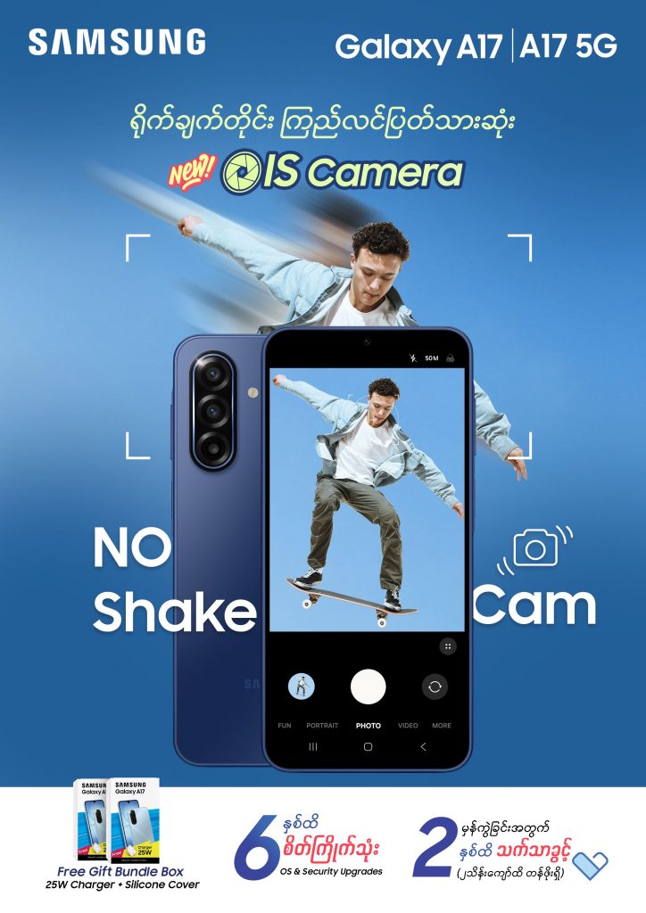 Samsung Myanmar ရဲ့ နေ့စဉ်ဘဝကို ပိုမိုအဆင်ပြေချောမွေ့အောင် ကူညီပေးမယ့် Awesome အဖြစ်ဆုံး Galaxy AI လုပ်ဆောင်ချက်များ ပါဝင်လာတဲ့ Galaxy A17 5G နဲ့ Galaxy A17 စမတ်ဖုန်းအသစ်တွေကို မြန်မာနိုင်ငံမှာ အထူးခံစားခွင့်၊ လက်ဆောင်များနဲ့အတူ ဝယ်ယူရရှိနိုင်နေပြီ ဖြစ်ပါတယ်။ အသစ်မိတ်ဆက်ပေးလိုက်တဲ့ Galaxy A Series စမတ်ဖုန်းတွေမှာ ဝေဝါးမှုကင်းတဲ့ ပုံရိပ်တွေပေးစွမ်းမယ့် OIS ကင်မရာလည်း ပါဝင်လာတာဖြစ်ပြီး ပရီမီယံဆန်တဲ့ ဒီဇိုင်း နဲ့ အဆင့်မြင့်လုပ်ဆောင်ချက်တွေကြောင့် သုံးစွဲသူများ နှစ်သက်သဘောကျစေမှာပါ။ “၆နှစ်အထိ” စိတ်ကြိုက်သုံးနိုင်စေအောင်ရည်ရွယ်ပြီး OS Update နဲ့ Security Upgrade တို့ကို ၆ နှစ်အထိ ပေးထားတဲ့အပြင် မတော်တဆ ထိခိုက်မှန်ကွဲခြင်းအတွက် “၂ နှစ်အထိ” တိုးမြင့်ကာကွယ်ပေးထားတဲ့ Samsung Care+ နဲ့ iP54 အဆင့်ရေစိုဒဏ်ခံနိုင်စွမ်းတို့ပါ ထည့်သွင်းပေးထားတဲ့အတွက် ရည်ရှည်စိတ်ချစွာအသုံးပြုနိုင်မှာ ဖြစ်ပါတယ်။