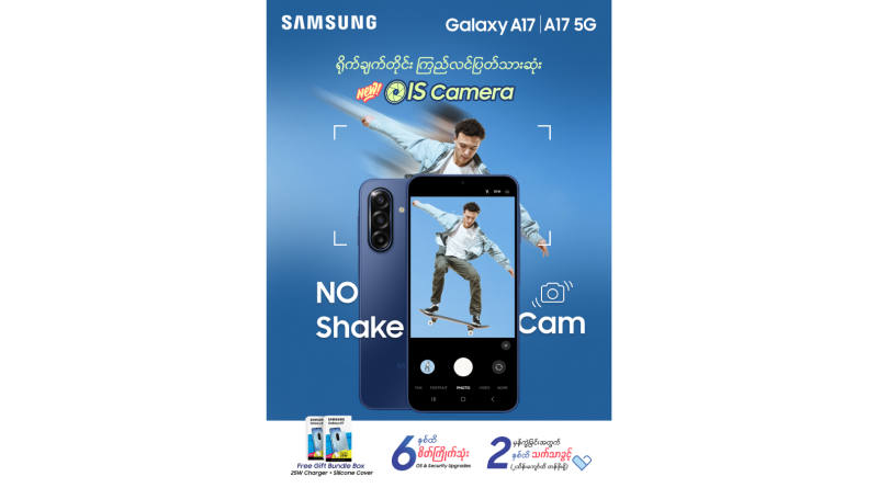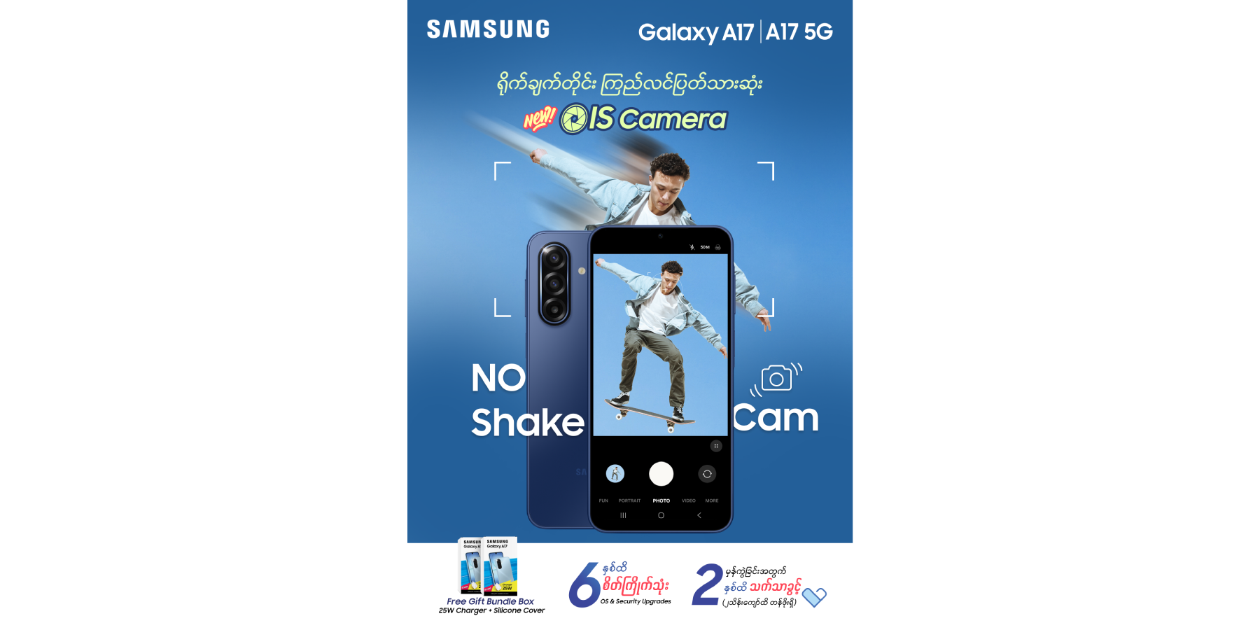 Samsung Myanmar ရဲ့ နေ့စဉ်ဘဝကို ပိုမိုအဆင်ပြေချောမွေ့အောင် ကူညီပေးမယ့် Awesome အဖြစ်ဆုံး Galaxy AI လုပ်ဆောင်ချက်များ ပါဝင်လာတဲ့ Galaxy A17 5G နဲ့ Galaxy A17 စမတ်ဖုန်းအသစ်တွေကို မြန်မာနိုင်ငံမှာ အထူးခံစားခွင့်၊ လက်ဆောင်များနဲ့အတူ ဝယ်ယူရရှိနိုင်နေပြီ ဖြစ်ပါတယ်။ အသစ်မိတ်ဆက်ပေးလိုက်တဲ့ Galaxy A Series စမတ်ဖုန်းတွေမှာ ဝေဝါးမှုကင်းတဲ့ ပုံရိပ်တွေပေးစွမ်းမယ့် OIS ကင်မရာလည်း ပါဝင်လာတာဖြစ်ပြီး ပရီမီယံဆန်တဲ့ ဒီဇိုင်း နဲ့ အဆင့်မြင့်လုပ်ဆောင်ချက်တွေကြောင့် သုံးစွဲသူများ နှစ်သက်သဘောကျစေမှာပါ။ “၆နှစ်အထိ” စိတ်ကြိုက်သုံးနိုင်စေအောင်ရည်ရွယ်ပြီး OS Update နဲ့ Security Upgrade တို့ကို ၆ နှစ်အထိ ပေးထားတဲ့အပြင် မတော်တဆ ထိခိုက်မှန်ကွဲခြင်းအတွက် “၂ နှစ်အထိ” တိုးမြင့်ကာကွယ်ပေးထားတဲ့ Samsung Care+ နဲ့ iP54 အဆင့်ရေစိုဒဏ်ခံနိုင်စွမ်းတို့ပါ ထည့်သွင်းပေးထားတဲ့အတွက် ရည်ရှည်စိတ်ချစွာအသုံးပြုနိုင်မှာ ဖြစ်ပါတယ်။