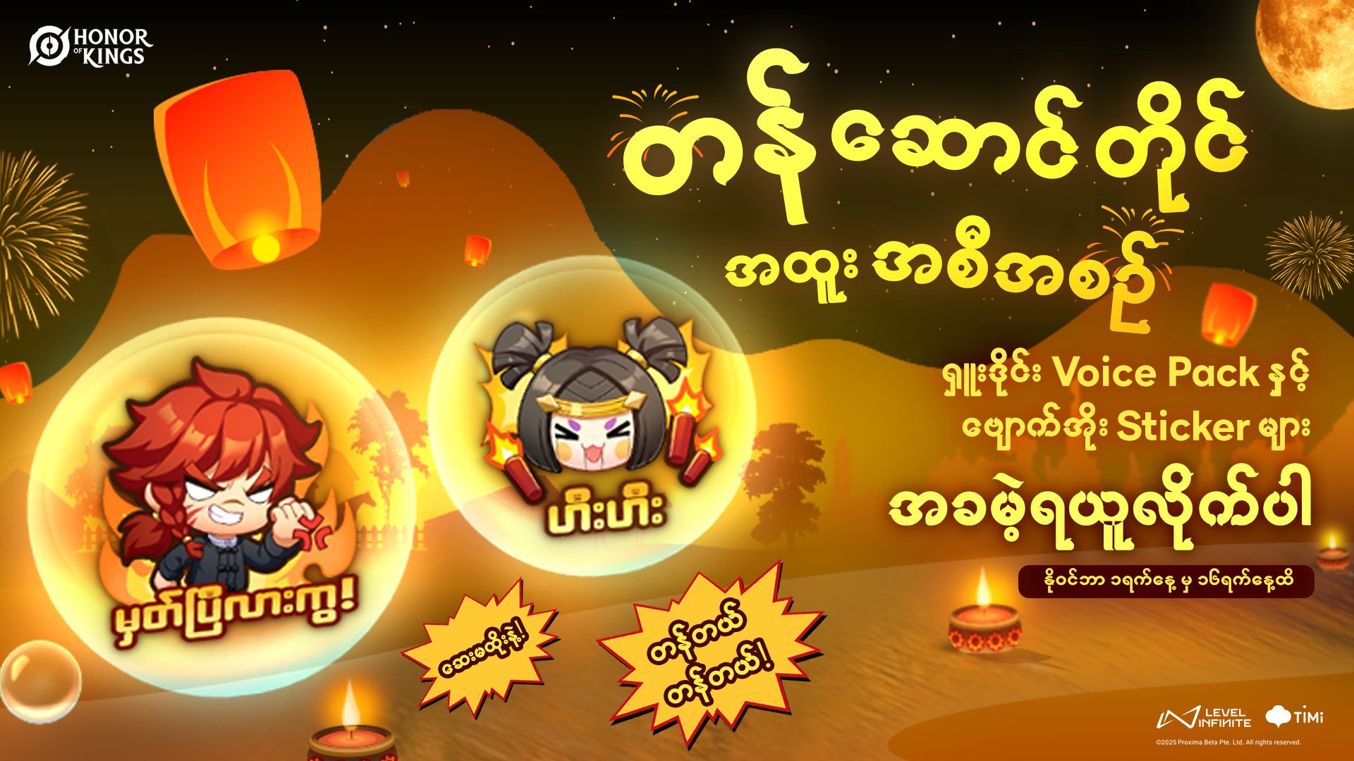 ကမ္ဘာကျော် နာမည်ကြီး ဂိမ်းတစ်ခုဖြစ်သည့်  HONOR OF KINGS (HOK) သည် မြန်မာနိုင်ငံမှ ချစ်ခင်အားပေးသူ ကစားသမားများအတွက် သီးသန့်ရည်ရွယ်၍ မြန်မာ့အလှအပအသွင်အပြင်နှင့် ယဉ်ကျေးမှုတို့ကို ပေါင်းစပ်ထည့်သွင်းဖန်တီးထားသော Voice Pack နှင့် Sticker များကို စတင် မိတ်ဆက်လိုက်ပြီဖြစ်ပါသည်။ ယခု မိတ်ဆက်လိုက်သည့် အဆိုပါ Voice Pack နှင့် Sticker များ အပြင် အခြား အပိုထပ်ဆောင်း လက်ဆောင်များကို နိုဝင်ဘာ ၁ ရက်နေ့မှ ၁၆ ရက်နေ့အတွင်း HONOR OF KINGS (HOK) တွင် In-game Missions များ ဆော့ကစားခြင်းဖြင့် အခမဲ့ ရရှိနိုင်မည်ဖြစ်ပါသည်။ အဆိုပါ Voice Line များနှင့် Sticker များကို ကစားသမားတွေအချင်းချင်း ပျော်ရွှင်စွာ ဆက်သွယ် ပြောဆိုနိုင်ရန်နှင့် မြန်မာ့ဂိမ်းအသိုက်အဝန်းကို အလေးထားသည့်အနေဖြင့် သီးသန့် ဖန်တီးထားခြင်းဖြစ်ပါသည်။
