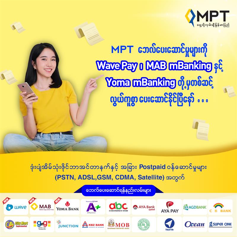 မြန်မာနိုင်ငံ၏ ပထမဆုံးနှင့် ဦးဆောင်ဆက်သွယ်ရေး အော်ပရေတာ ဖြစ်သော MPT သည် သုံးစွဲသူများ ပိုမိုအဆင်ပြေစေရန်အတွက် ငွေပေးချေမှု နည်းလမ်းအသစ်များကို တိုးချဲ့ဆောင်ရွက်လျက်ရှိပါသည်။ MPT သည် Postpaid သုံးစွဲသူများ (B2C) နှင့် FTTH သုံးစွဲသူများအတွက် Wave Pay၊ Myanmar Apex Bank (MAB iBanking)နှင့် Yoma Bank (mBanking) များအပြင် (B2B) သုံးစွဲသူများအားလုံးအတွက်လည်း Myanmar Apex Bank (MAB iBanking) နှင့် Yoma Bank (mBanking) များနှင့်အတူ ပူးပေါင်းဆောင်ရွက်၍ နည်းလမ်းအသစ်များ အသုံးပြုပြီး လွယ်ကူချောမွေ့စွာ ငွေပေးချေနိုင်ပြီ ဖြစ်ပါသည်။