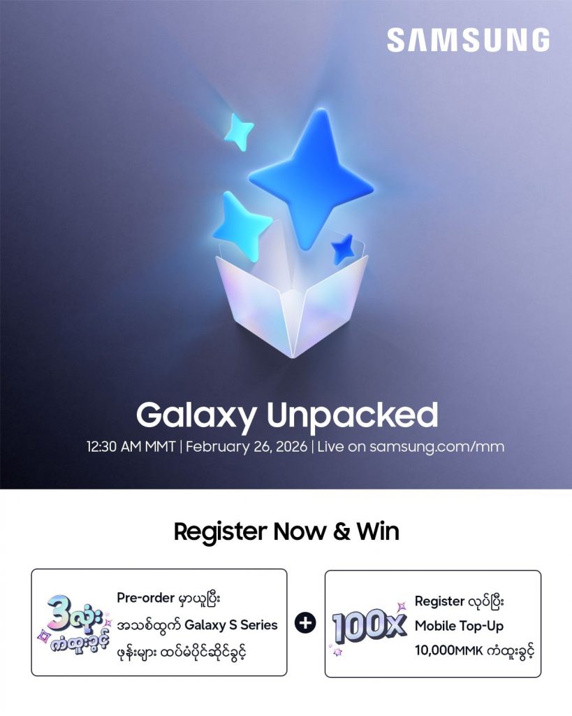 Samsung Electronics ကနေ Galaxy Unpacked မိတ်ဆက်ပွဲကြီးကို ဆန်ဖရန်စစ္စကို မြို့မှာ ကျင်းပသွားတော့မှာဖြစ်ပြီး Samsung ရဲ့ ဆန်းသစ်တီထွင်မှုတွေနဲ့ နောက်ဆုံးပေါ် Galaxy အသစ်တွေကို မိတ်ဆက်ပေးလာတော့မှာပါ။ ဉာဏ်ရည်တုနည်းပညာက သုံးစွဲသူတွေနဲ့တစ်သားတည်းဖြစ်လာပြီး ကိုယ့်လိုအပ်ချက်အလိုက် ပြောင်းလဲကူညီပေးနိုင်လာတာနဲ့အမျှ AI ခေတ်ရဲ့ အပြောင်းအလဲသစ်တစ်ခုကို ယူဆောင်လာတော့မှာပဲဖြစ်ပါတယ်။ အဆိုပါ Galaxy Unpacked February 2026 ပွဲကြီးရဲ့ ရင်ခုန် စိတ်လှုပ်ရှားစရာ အခိုက်အတန့်တွေကို samsung.com.mm၊ Samsung Newsroom ၊ Samsung Myanmar Facebook Page နဲ့ Samsung Myanmar YouTube Channel တို့မှာ တိုက်ရိုက်ထုတ်လွှင့် တင်ဆက်ပေးသွားဦးမှာဖြစ်ပြီး ဖေဖော်ဝါရီလ (၂၆) ရက်နေ့၊ မြန်မာစံတော်ချိန် ည (၁၂) နာရီခွဲအချိန်မှာ စတင်ကြည့်ရှုနိုင်မှာပါ။