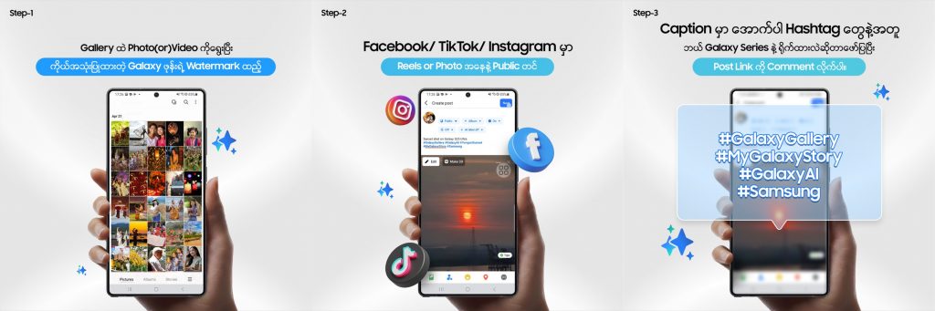 Captionမှာ ဘယ် Galaxy ဖုန်း မော်ဒယ် နဲ့ ရိုက်ထားလဲဆိုတာ ဖော်ပြပြီး ကိုယ်ပိုင် ထည့်လိုသော Story Hashtag နဲ့အတူ #GalaxyGallery #MyGalaxyStory #GalaxyAI #Samsung Hashtag တွေကို ထည့်ပြီး Publicနဲ့ တင်ပါ။